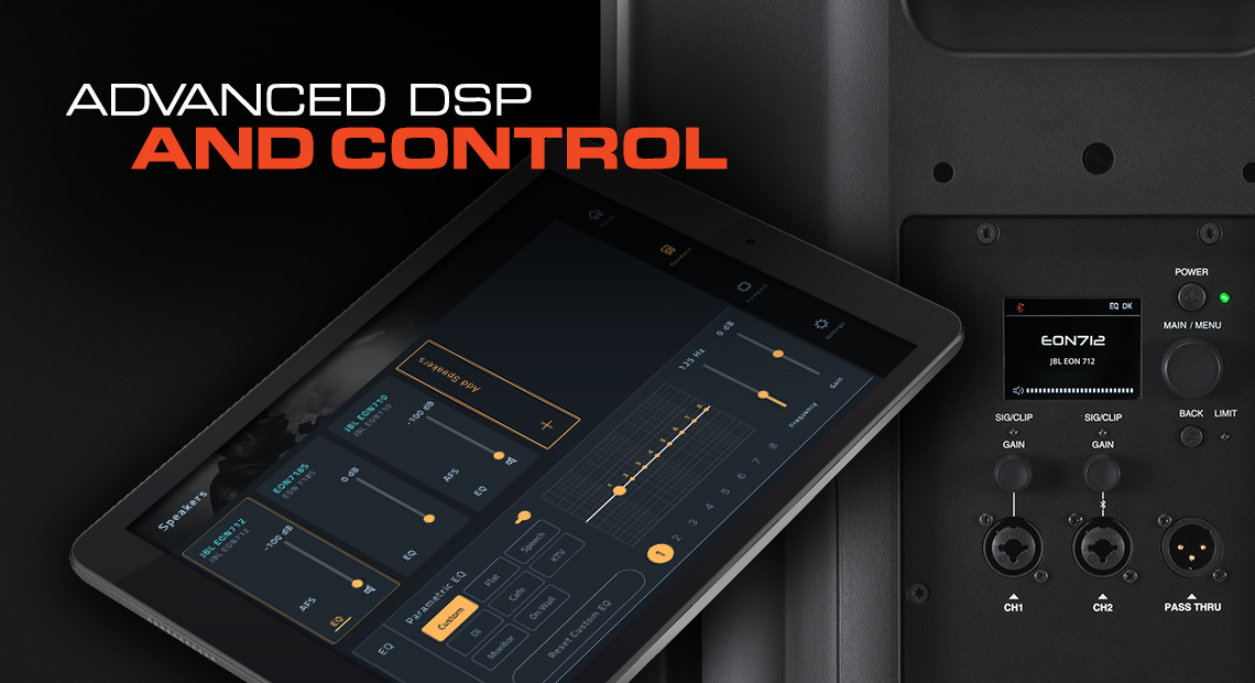 Bộ xử lý âm thanh kỹ thuật số DSP nâng cao của EON700 cung cấp khả năng kiểm soát toàn diện từ EQ, giới hạn (limiters), độ trễ (delay), chống hú rít, âm lượng và các chức năng loa khác. Truy cập cài đặt trên loa bằng màn hình LCD có đèn nền tích hợp hoặc từ app JBL Pro Connect.