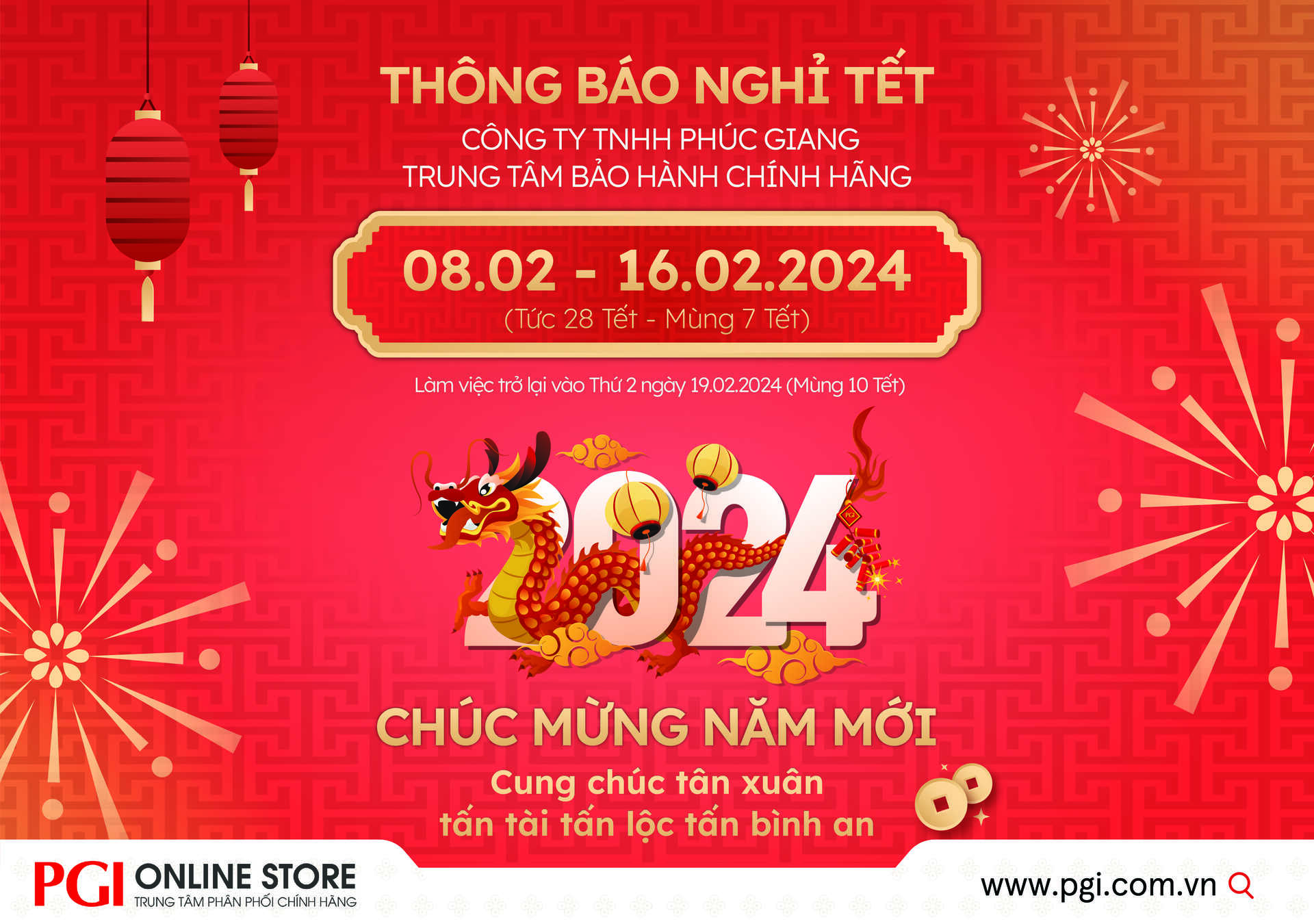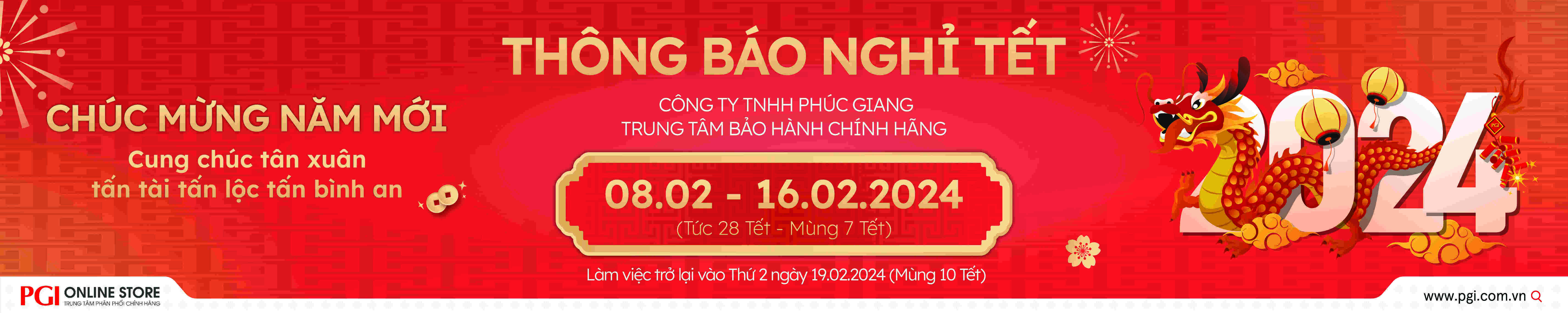 Nhằm đảm bảo chất lượng và đáp ứng yêu cầu phục vụ của khách hàng mua hàng, bảo hành và sửa chữa sản phẩm trong thời điểm cuối năm, PGI xin thông báo đến Quý Khách hàng thời gian nghỉ Tết Nguyên Đán 2024 của Công ty và Trung tâm bảo hành như sau: