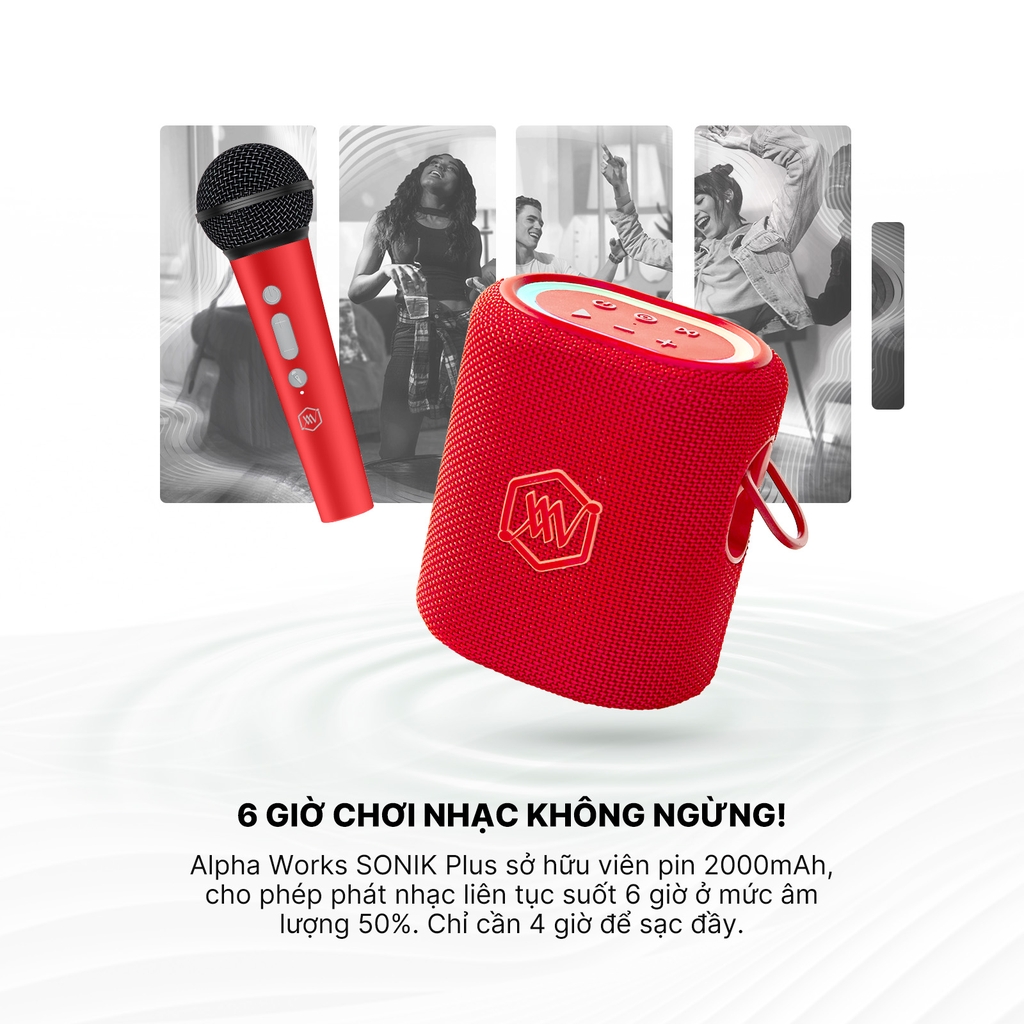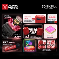 Chào đón Alpha Works SONIK Plus (AW-SONIK+) - chiếc loa di động kết hợp micro không dây, mang đến âm thanh nội lực và khả năng karaoke cực kỳ dễ dàng. Với thiết kế nhỏ gọn, công nghệ hiện đại và thời gian sử dụng dài, AW-SONIK+ sẽ là người bạn đồng hành tuyệt vời cho mọi cuộc vui, từ các buổi tiệc, lớp học đến những chuyến dã ngoại đầy thú vị.