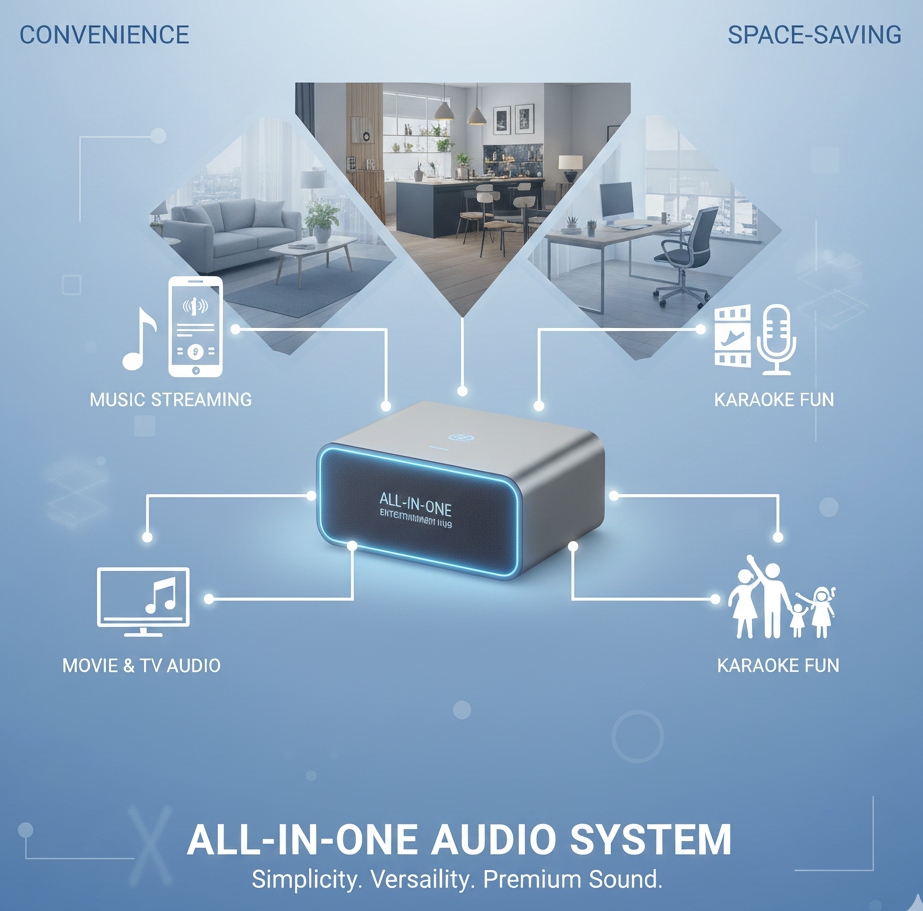 Thiết bị âm thanh All-in-One ngày càng được ưa chuộng vì mang lại sự tiện lợi, gọn gàng và dễ sử dụng. Chỉ với một hệ thống duy nhất, người dùng có thể nghe nhạc, xem phim hoặc hát karaoke mà không cần lắp đặt phức tạp hay nhiều thiết bị rời.